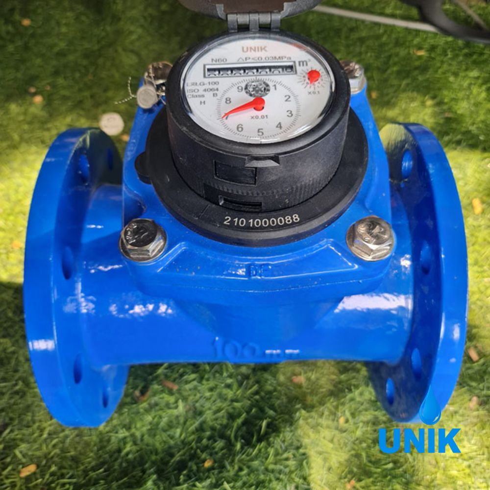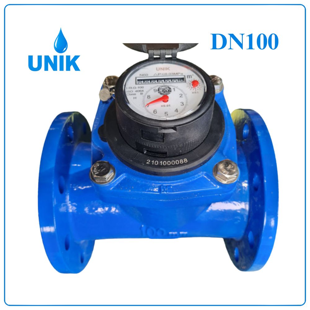 Đồng hồ nước sạch UNIK DN100 là thiết bị đo lưu lượng nước sạch sử dụng cho hệ thống đường ống DN100 (4 inch ~ phi 114mm). Đây là dòng đồng hồ cơ dạng tuabin, truyền động từ, chuyên dùng cho hệ thống cấp nước quy mô lớn như nhà máy, khu công nghiệp và hệ thống cấp nước đô thị.